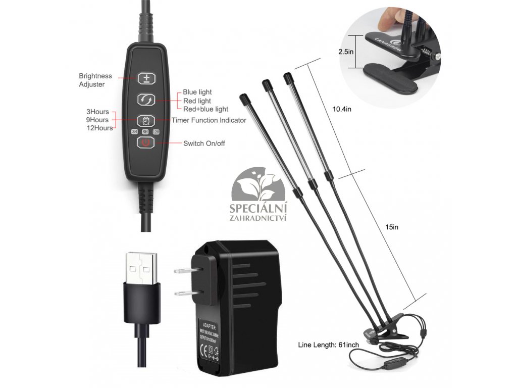Tři LED trubice o délce 22cm na ,,husím krku", takže je můžete nastavit do libovolné polohy, v dolní části spojené silným klipsem, díky kterému se dají snadno přichytit na polici nebo na tyč pěstebního boxu či okenní parapet. Součástí LED Plant Grow Light 30W je i malý ovladač, na kterém si můžete nastavit typ světelného spektra růst, květ či plné spektrum, dále lze ovladačem nastavit intenzitu svícení nebo nastavit časovač - délku svícení, na volbu máte ze tří režimů, 3 hodiny, 6 hodin nebo 12 hodin svícení. Světlo je kompletní, nic není třeba zapojovat, po vybalení ihned svítí. Díky svému tvaru se tomuto osvětlené říká rovněž LED tykadla. Prodáváme i ve verzi 40W(4xLED trubice) a 20W(2xLED trubice).